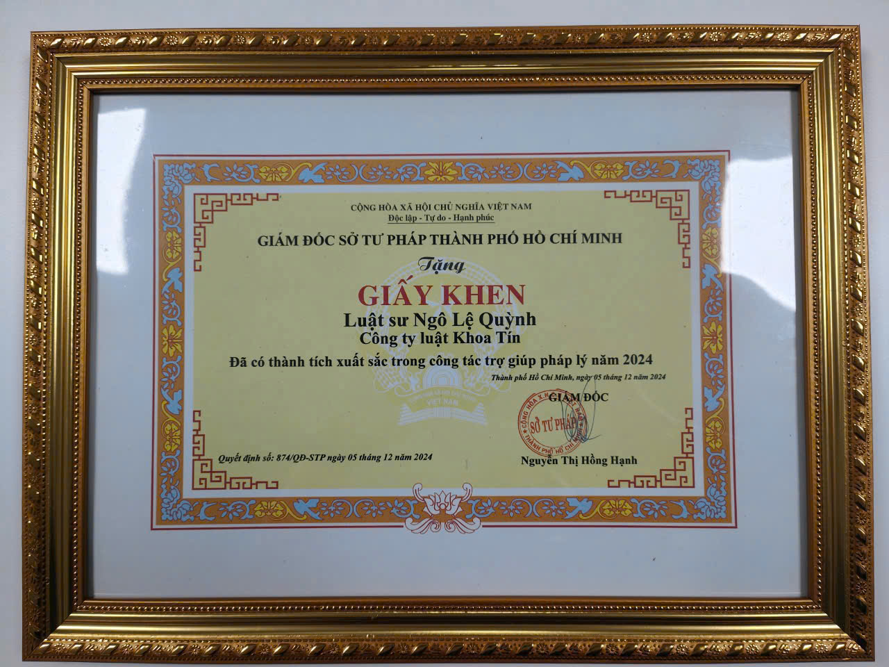 Giấy khen của Sở Tư pháp Thành phố Hồ Chí Minh đối với Luật sư đã có thành tích xuất sắc trong công tác trợ giúp pháp lý