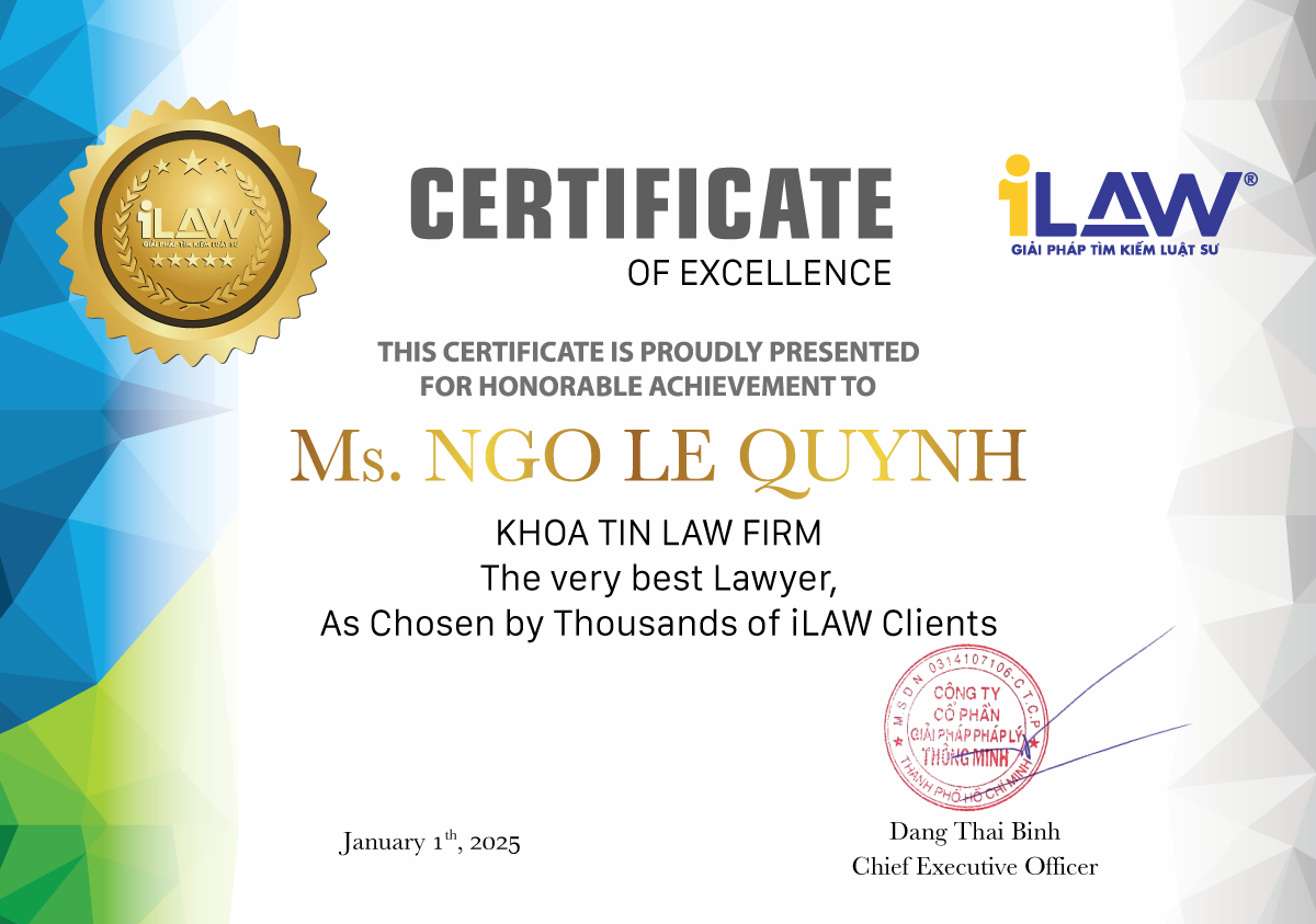 Biết đến chị khi phụ trách tư vấn pháp lý liên quan đến tranh chấp đất đai cho gia đình tôi. Qua rất nhiều lần sử dụng dịch vụ của luật sư và công ty Luật TNHH Khoa Tín, tôi đã tin tưởng giới thiệu cho bạn bè và đối tác của tôi. Nay tôi đang sử dụng dịch vụ Luật sư riêng của chị Quỳnh. Chỉ cần alo là chị hỗ trợ pháp lý cho tôi và gia đình tôi mọi lúc mọi nơi. Nhanh chóng, chất lượng, có tầm và có tâm.
